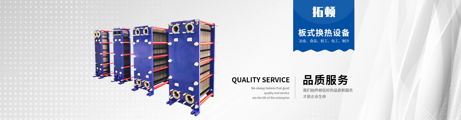 經(jīng)過持續(xù)努力,拓頓取得了質(zhì)量、健康和環(huán)境體系的“三標(biāo)一體”認(rèn)證、美國ASME 認(rèn)證。制造許可證等體系認(rèn)證; 公司以8大族群30余種換熱產(chǎn)品為載體, 為化工、冶金、供熱、機(jī)械油冷、醫(yī)藥、造紙、輕紡、船舶、石油、電力、集中供暖、空調(diào)制冷、食品飲料、海水淡化、海水養(yǎng)殖,生物質(zhì)能分布式能源等行業(yè)提供個(gè)性化、專業(yè)化的解決方案用于加熱、冷卻、蒸發(fā)、冷凝、殺菌毒、余熱回收等。